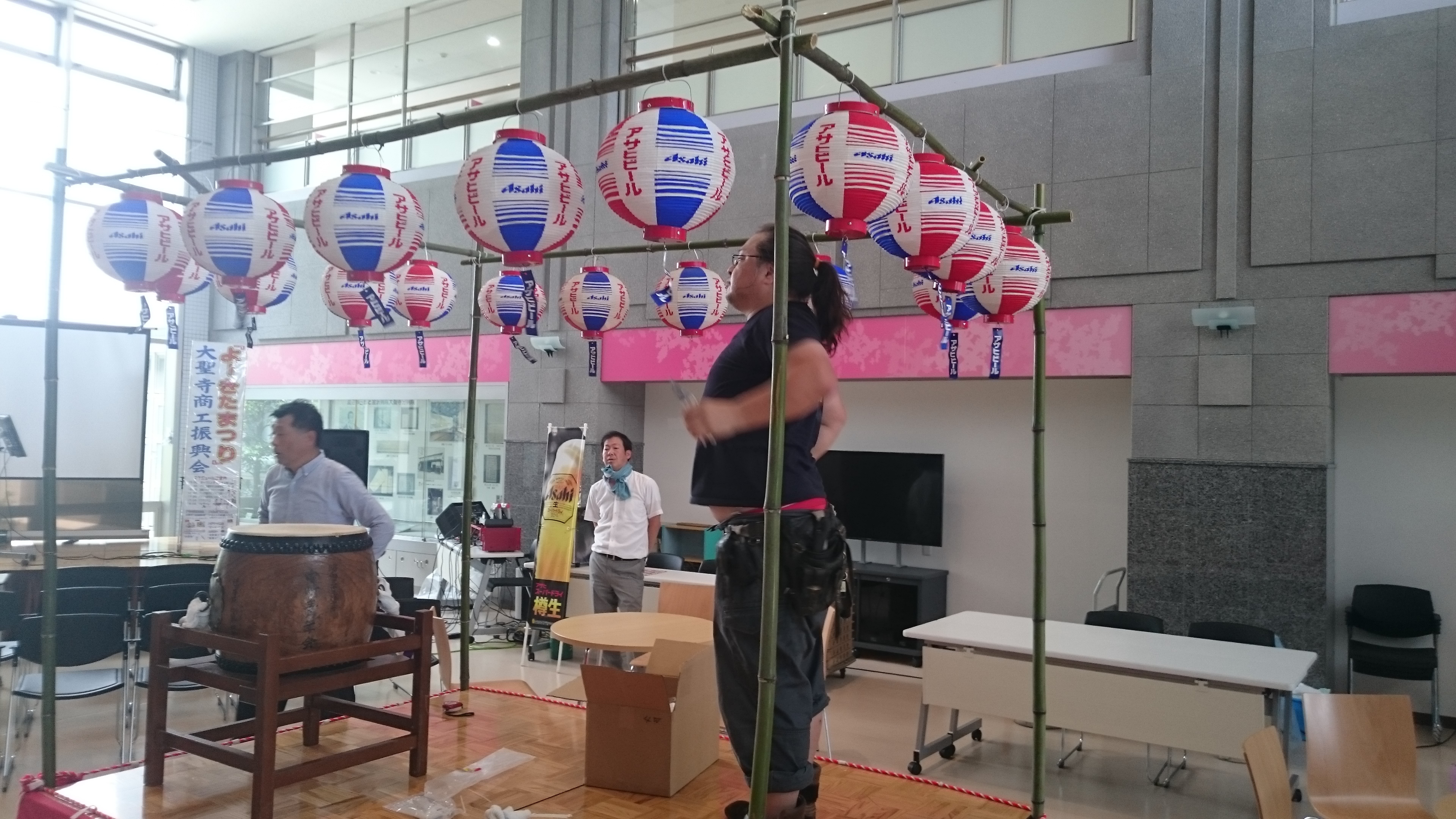 会場の方も前日夜にほぼ準備はすませていましたが、当日朝輪踊り用のやぐらを組み立てるのをみると、お祭り気分も高まってきました。