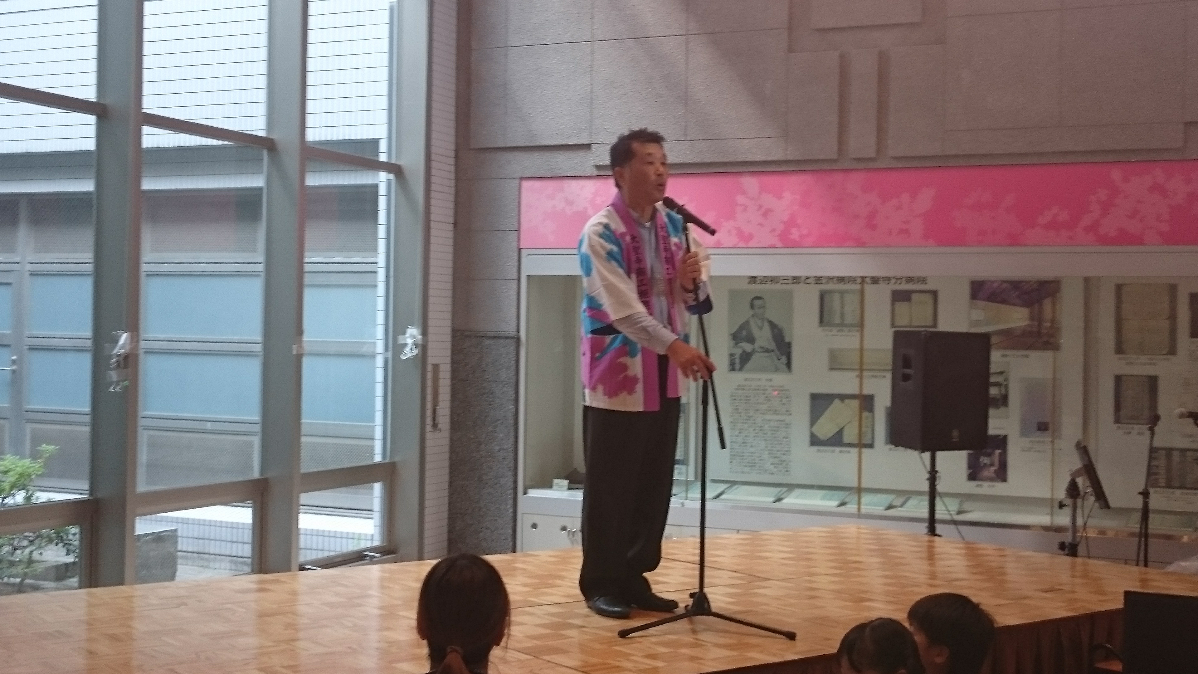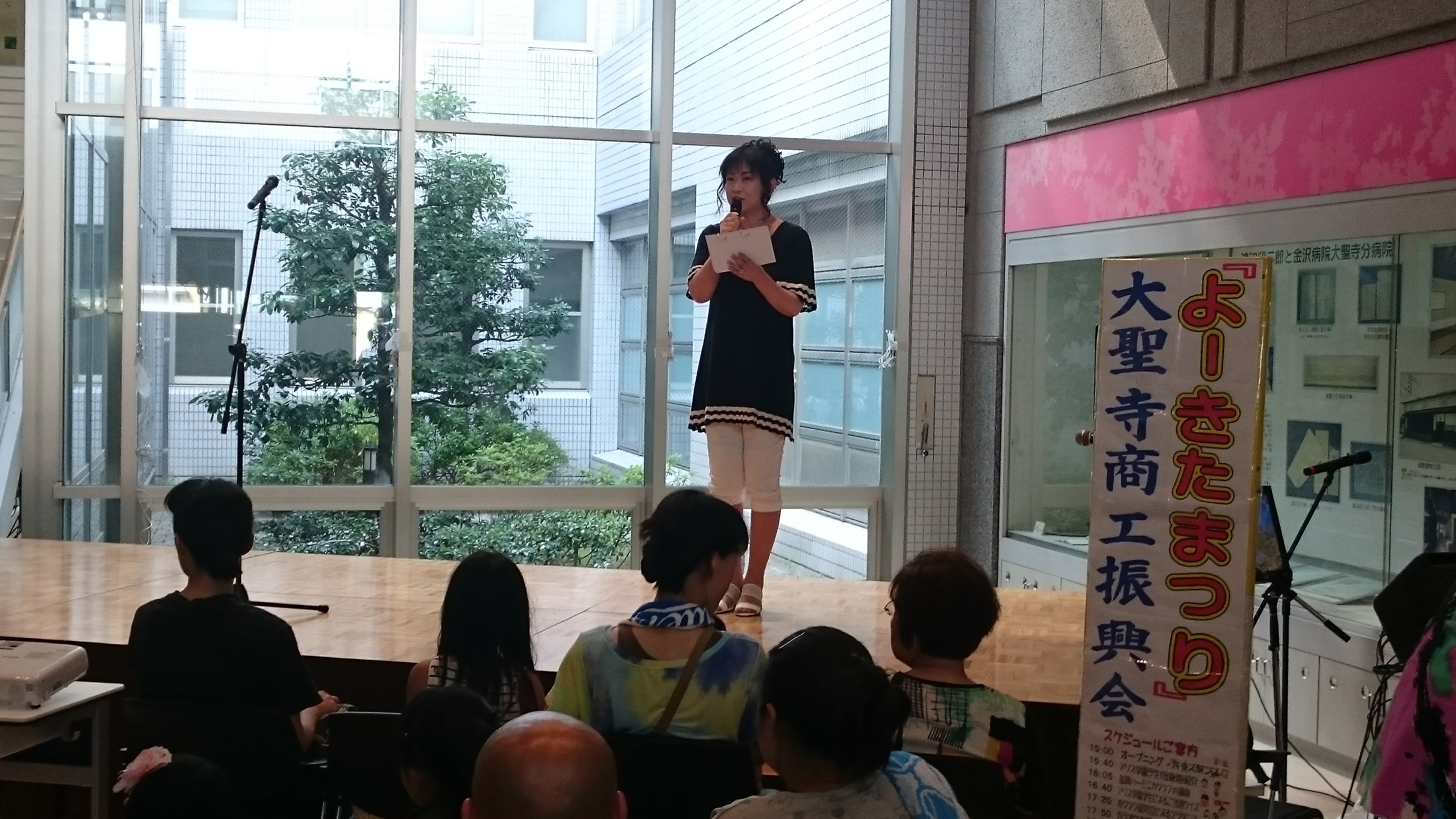 おまつりの司会進行役のかが総合サービス株式会社の出仙まゆみさんです。KAGAけんこうフェスタの司会をされていたのをみて、今回よーきたまつりの司会をお願いしたしたところ、快く承諾してもらえました。