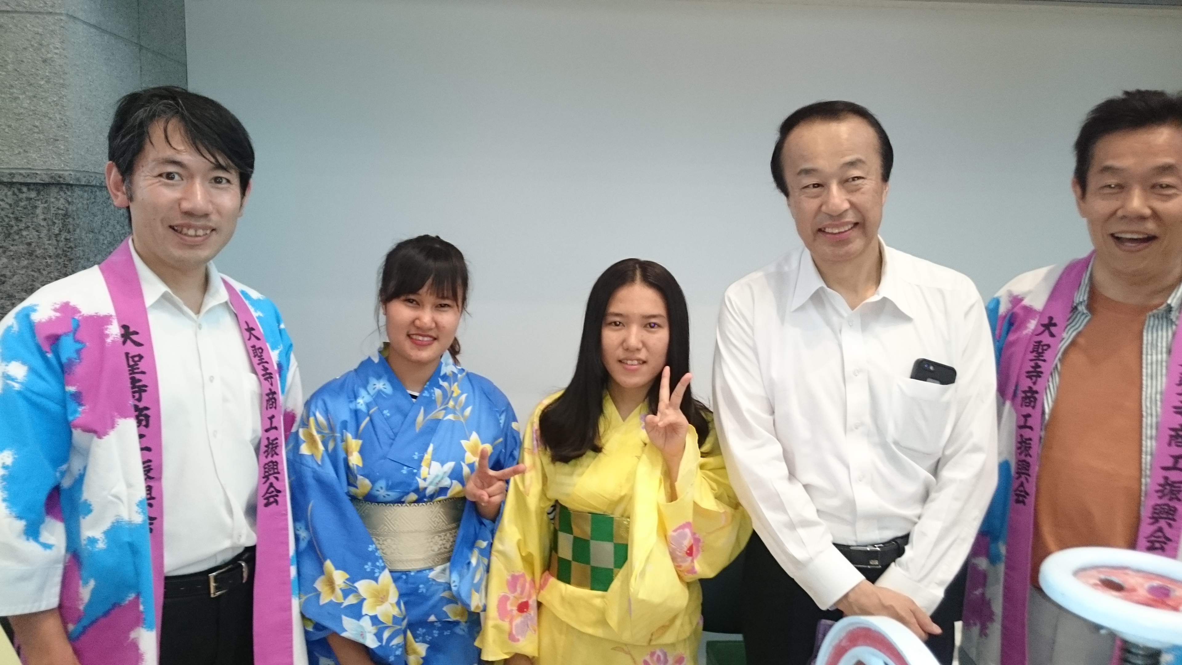 アリス学園の留学生の生徒さん達に浴衣に着替えてもらい、お祭り気分を演出。みんなの日本でのいい思い出になってくれることでしょう。当会会員や市長との記念写真でも大喜びでした。