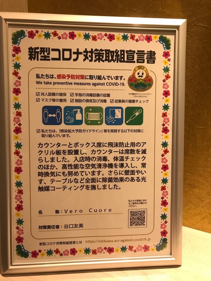 このほか、カウンターには飛沫対策としてアクリル板を設置し、店内全面、テーブル・イスなどなどに除菌効果のある光触媒コーティングを施工しました。