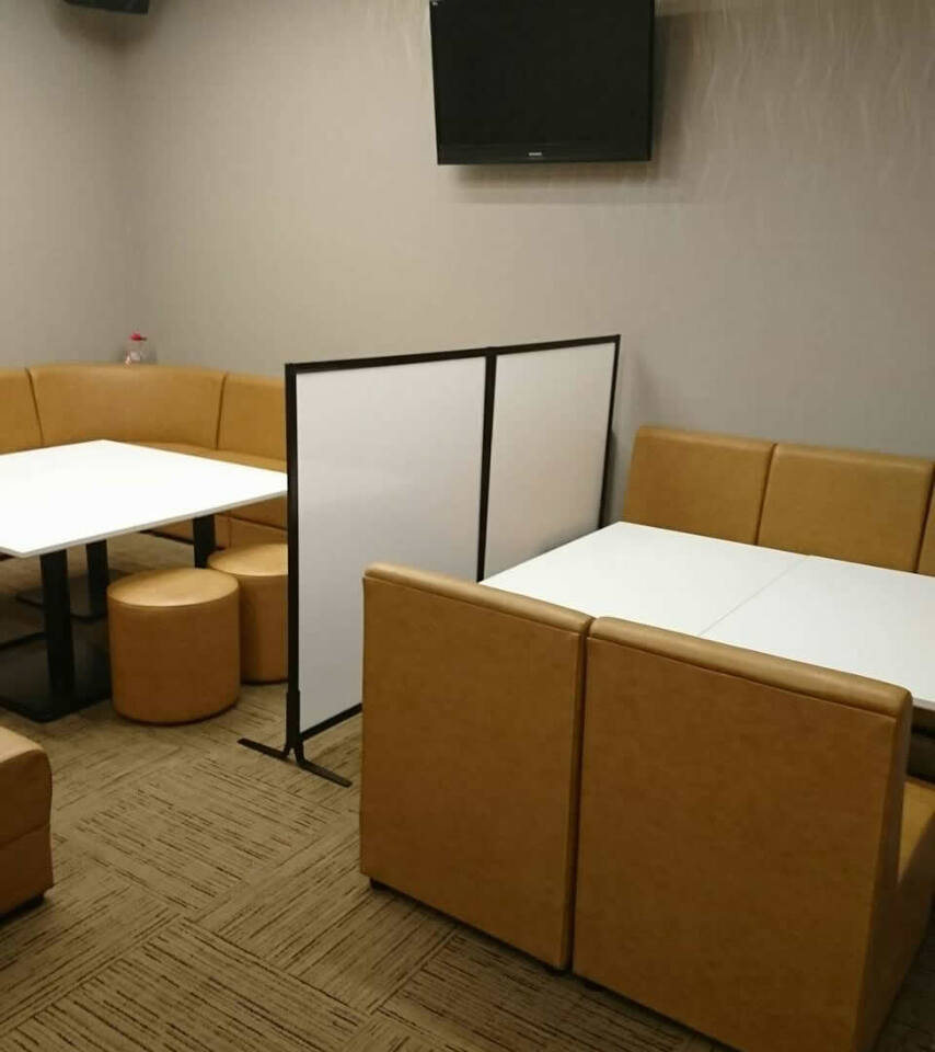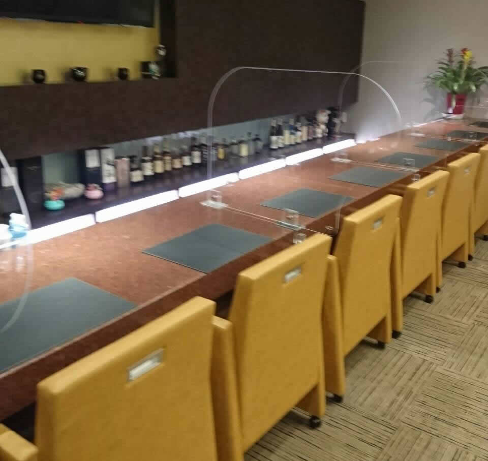 現在当店では新型コロナウイルス対策として、入り口にアルコール消毒を設置し、店内ではカウンターにアクリル板。ボックス席の間には間仕切りを設置。